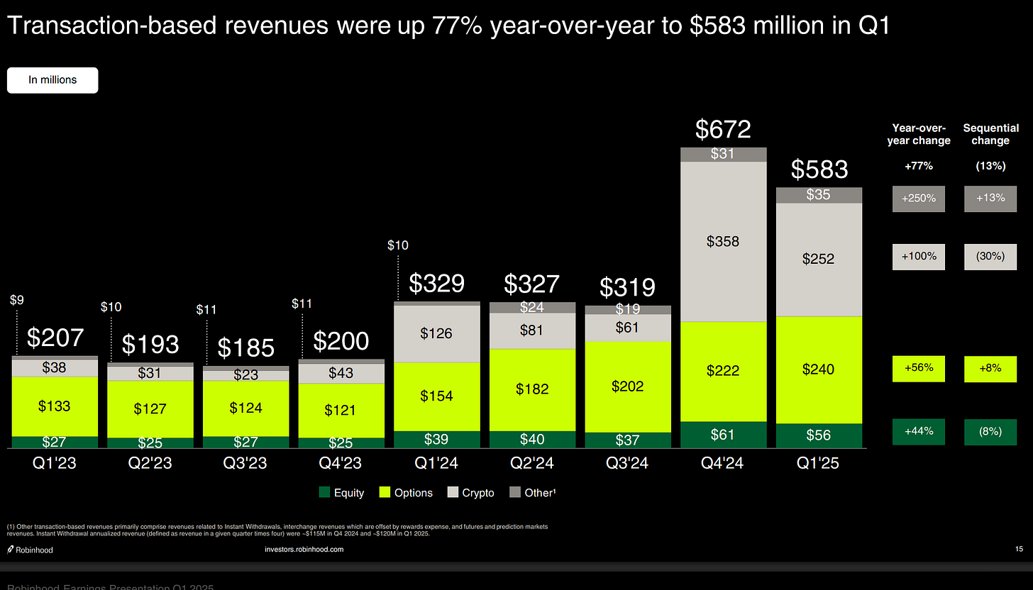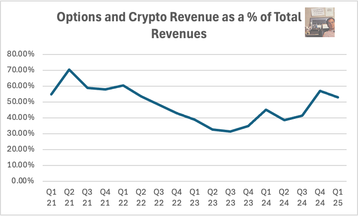 In Q1 ‘21 Options and Crypto revenues were 88M and 198M respectively of a total 522M in Revenues. In Q1 25 they were 240M and 252M respectively of a total 927M. Ergo, in Q1 ‘21 Options and Crypto accounted for 54.79% of Total Revenues and in Q1 ‘25 they accounted for 53.07%.